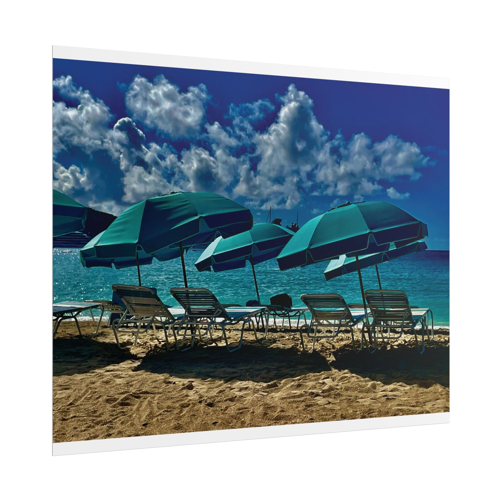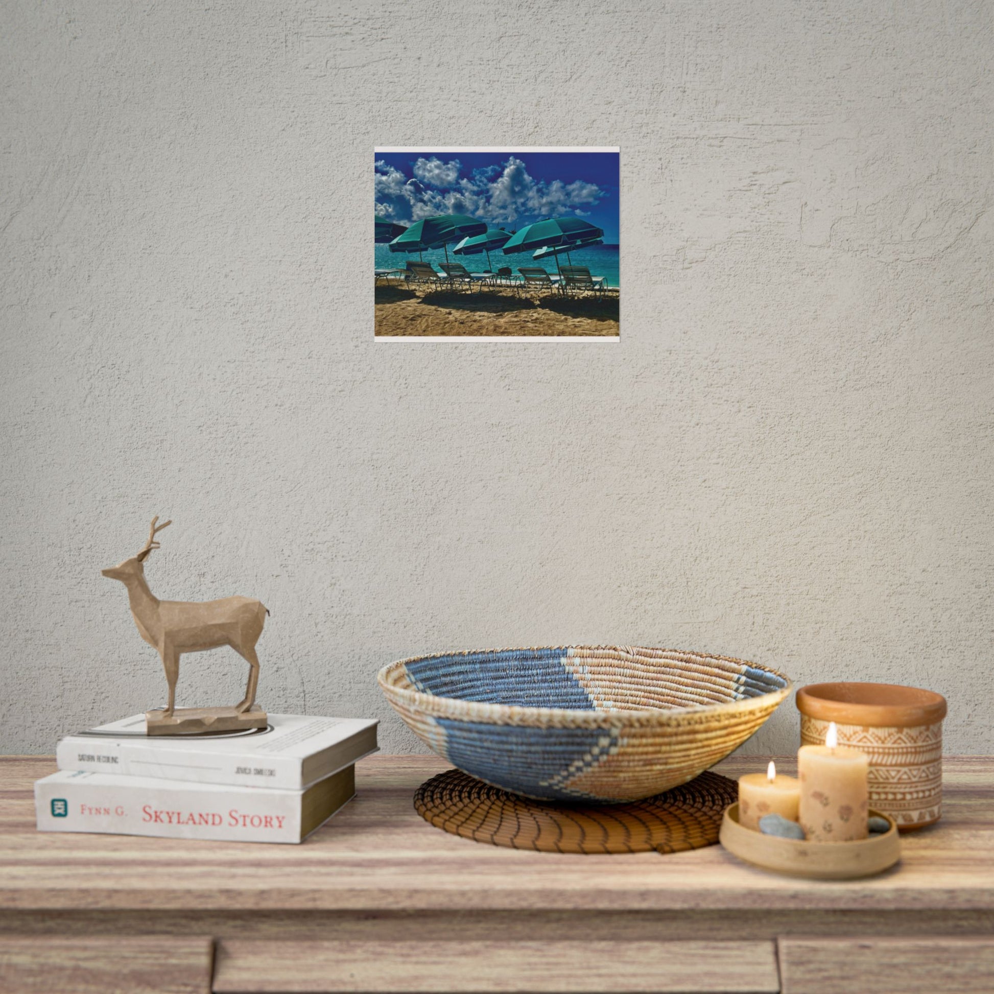 Dianc i'r Caribî bob tro y byddwch chi'n edrych ar eich wal gyda'rArlliwiau Paradwysposter. Mae'r ffotograff bywiog hwn yn dal rhythm tawel bywyd traeth — rhesi o ymbarelau turquoise, tywod euraidd, a dyfroedd glas tawel o dan ganopi o gymylau blewog. Mae'n atgof gweledol o foreau tawel, awelon y cefnfor, a thawelwch heulog.
