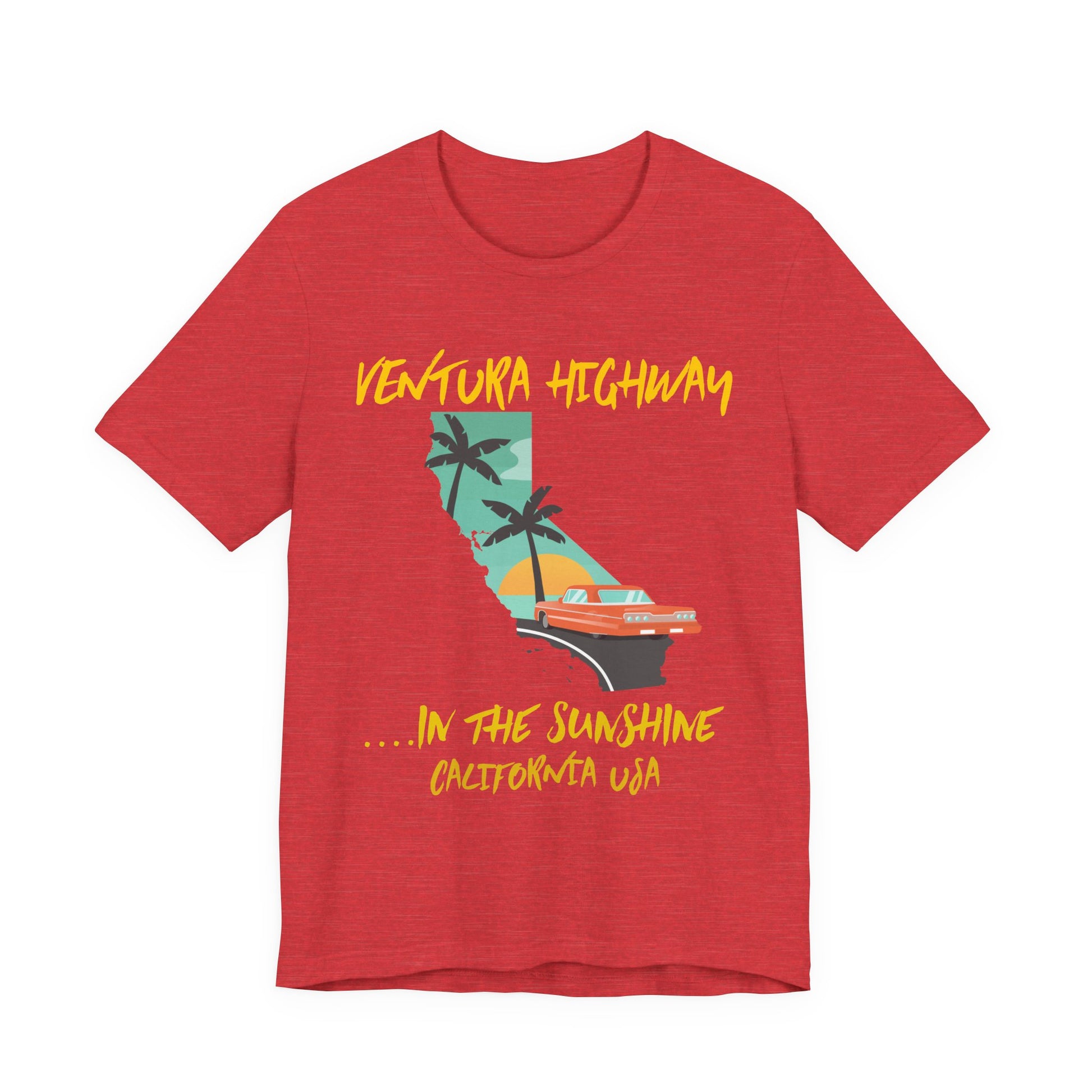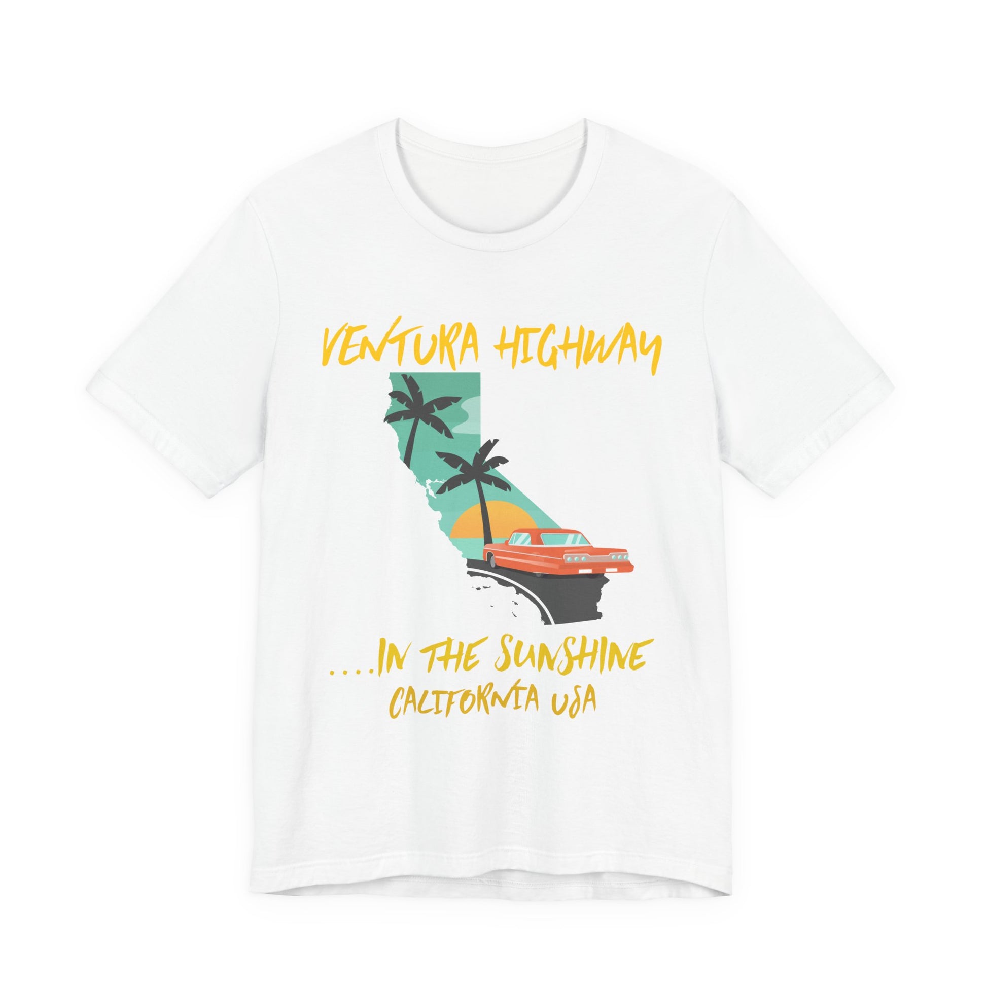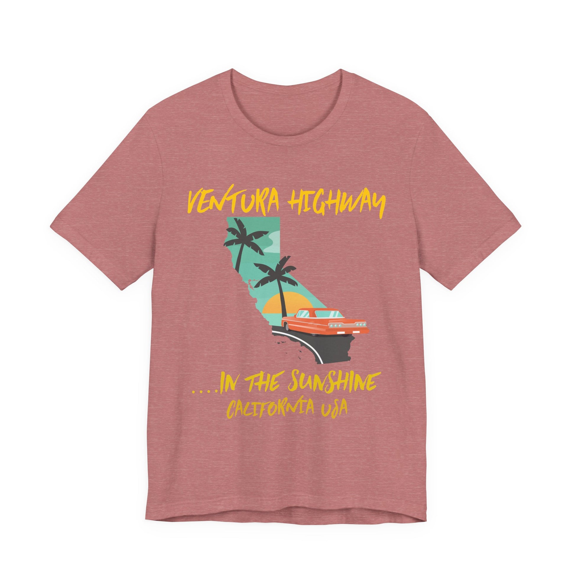 Dewch â naws y dalaith euraidd ble bynnag yr ewch gyda'r crys-t Ventura Highway wedi'i ysbrydoli gan hen bethau. Gyda silwét Califfornia llachar, coed palmwydd yn siglo yn yr heulwen, a char retro clasurol yn teithio i lawr yr arfordir, mae'r crys-t hwn yn dal ysbryd digalon teithiau ffordd eiconig Arfordir y Gorllewin.