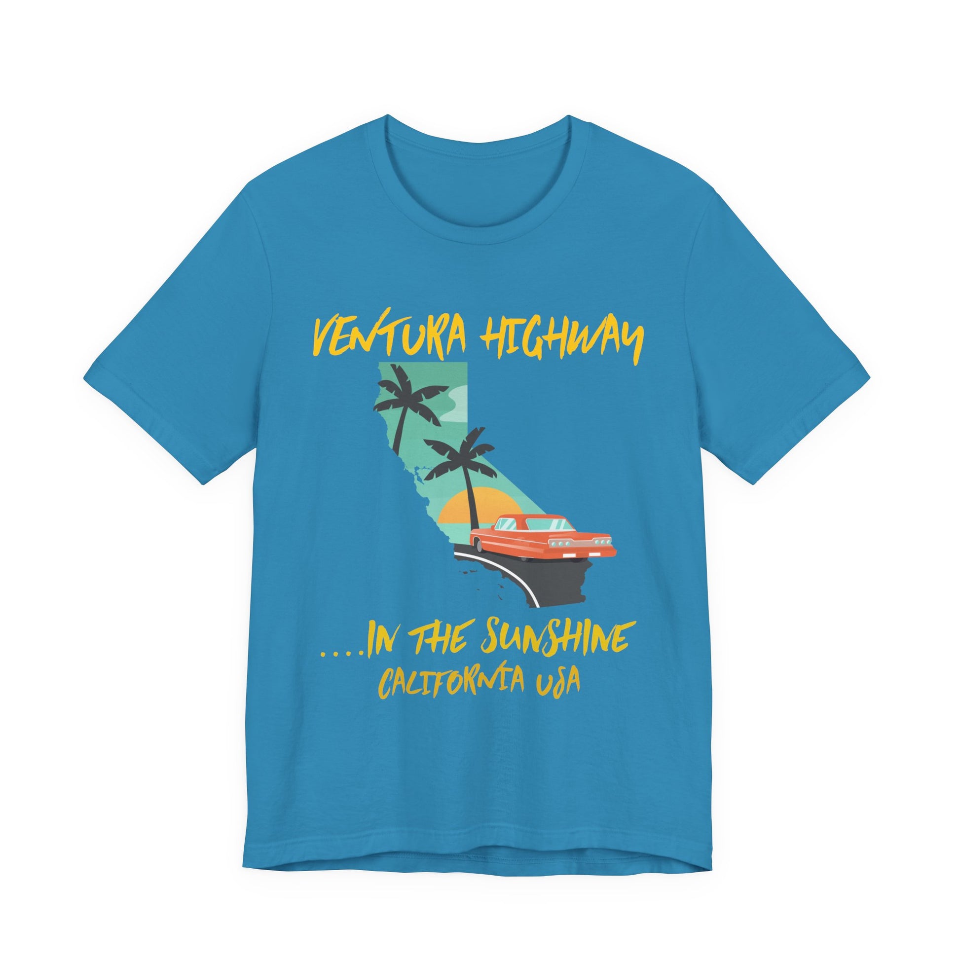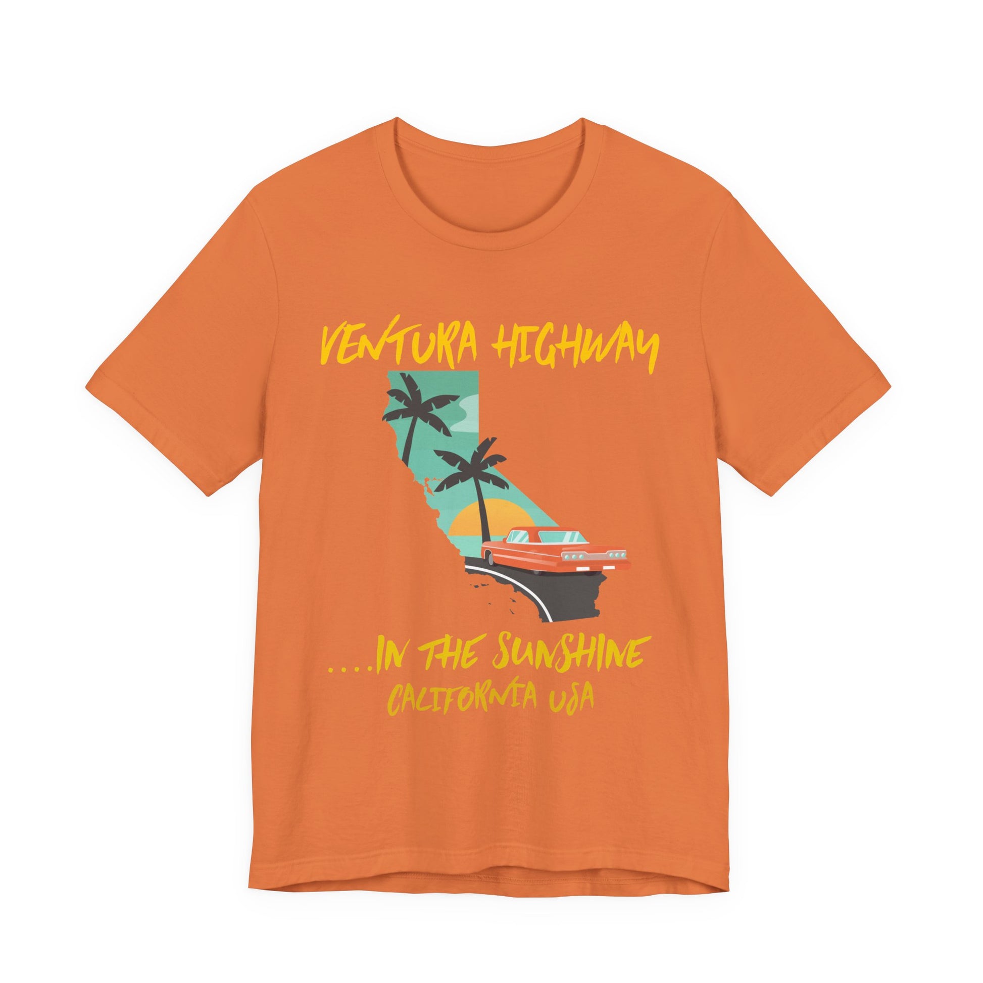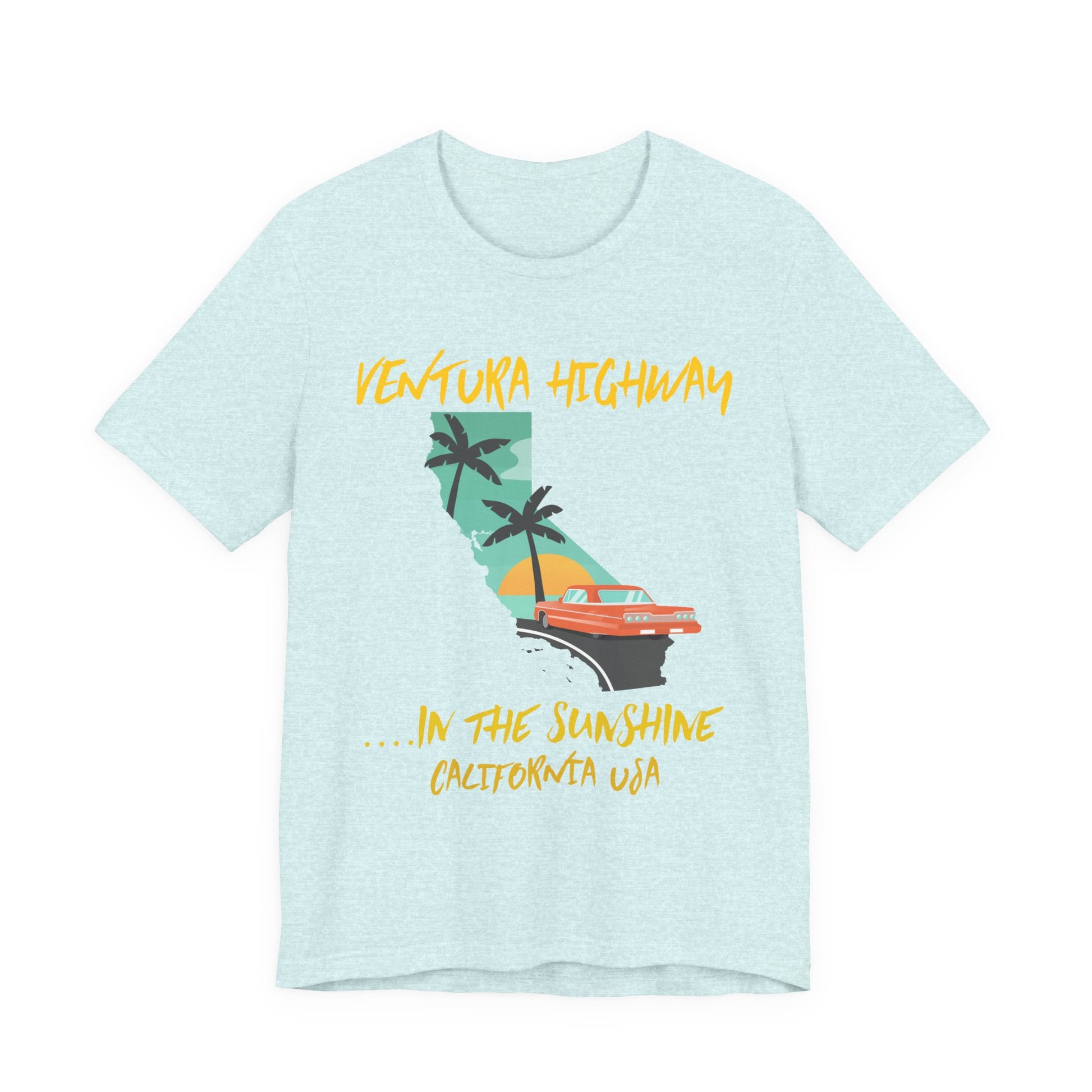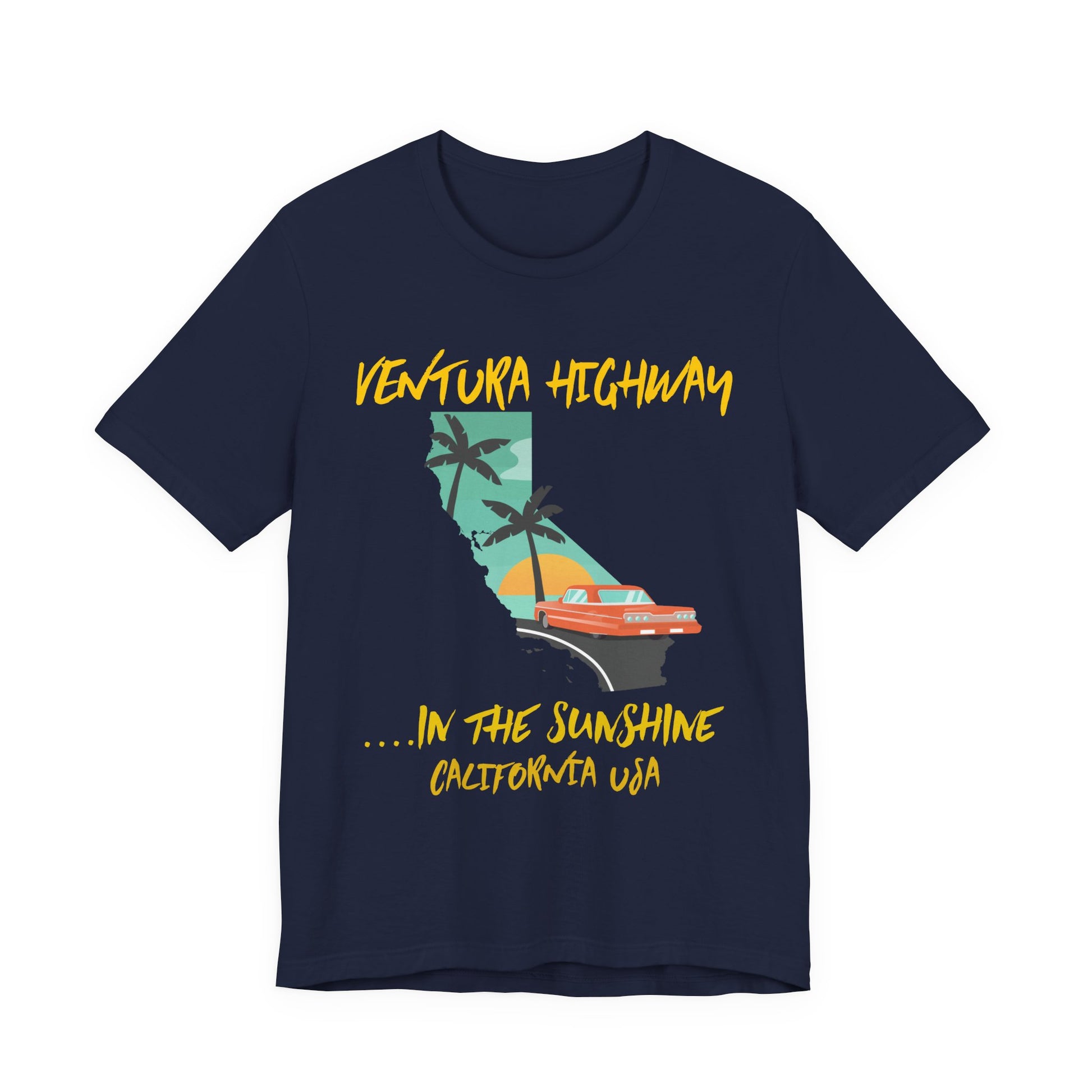 Dewch â naws y dalaith euraidd ble bynnag yr ewch gyda'r crys-t Ventura Highway wedi'i ysbrydoli gan hen bethau. Gyda silwét Califfornia llachar, coed palmwydd yn siglo yn yr heulwen, a char retro clasurol yn teithio i lawr yr arfordir, mae'r crys-t hwn yn dal ysbryd digalon teithiau ffordd eiconig Arfordir y Gorllewin.