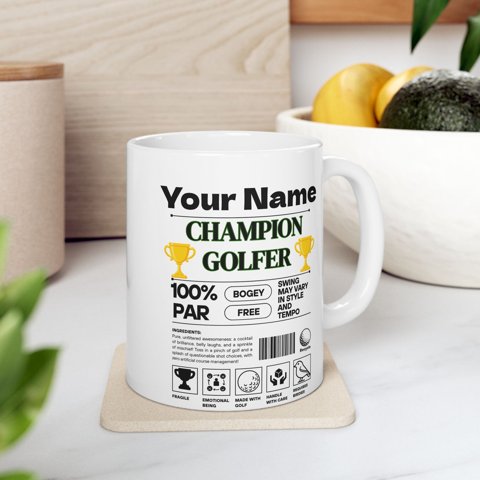 Dechreuwch eich bore yn berffaith gyda'r Mwg Golffiwr Pencampwr Personol hwn, yr anrheg golff doniol berffaith i unrhyw un sy'n caru'r gwyrdd! Wedi'i ddylunio fel parodi o label maeth, mae'r mwg hwn yn dathlu hoff "gynhwysion" pob cariad golff - amynedd, cywirdeb, a dos iach o adar bach.